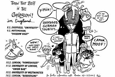 ¿Cómo descubre un españolito a TTBITG?, en mi caso gracias a la devoción que tenÃa por uno de los sellos más maravillosos del Indie Pop mundial de principios de los 90’s; Heaven Records, el sello regentado por Matt de los Fat Tulips donde se publicaron algunos de los discos de su banda y otros de los mejores grupos indies de entonces, como Confetti, Strawberry Story, los Melons (ex-Fat Tulips)…y nuestros TTBITG. Heaven era uno de esos minúsculos sellos de los que te comprabas absolutamente todo, de modo que tampoco te molestabas en indagar sobre los grupos antes de hacer un pedido (todavÃa no existÃa aquello del mp3), y asà aprovechando que me faltaba un 7†de los Fat Tulips un dÃa encargué también mi primer disco de TTBITG, un 7†precioso que rezaba en la portada Chill Out With Throw That Beat in the Garbagecan! , en realidad entonces pensé que ese era el nombre del grupo, en la portada aparecÃan caricaturizados los miembros del grupo sobre el globo terráqueo. Lo primero que me llamó la atención del disco era la hojita interior que lo acompañaba, en vez del tÃpico mini-fanzine o postal que se adjuntaba con los discos del sello, en esta ocasión habÃa un graciosÃsimo e impagable cómic en el que aparecÃan los miembros de la banda en una gira por Inglaterra, estaba firmado por Klaus Cornfield, lÃder del grupo. Después de esto solo quedaba poner la aguja sobre el disco y escuchar las tres canciones contenidas en el disco, empezó a sonar Just Sixteen y aquello pintaba bien, purito Indie Pop al estilo de los Fat Tulips, pero con más ritmo, energÃa, un estribillo contagioso y con un final de tema marcado por una guitarra afilada que te dejaba descolocado. Estaba bien, pero habÃa que seguir, darle la vuelta al disco y probar los otros dos temas, Lotsi Gogo y You’re Exactly What I Want, la primera empezaba con un puntito macarra, Klaus empezaba a cantar y un coro de chicas le seguÃa con estribillo y los tÃpicos pa-para-pa-pa-paraaaa, volvÃan a hacer sonar unas guitarras contundentes y de pronto estabas metido en una canción que te hacÃa bailar sin remedio, era un Pop loco y divertido, como si Heavenly hubiera estado liderado por Fred Schneider y Kate Pierson de los B-52’s. El último tema del single era quizás el más convencional, también el más bonito y redondo, después de esto habÃa que seguir buscando más canciones.